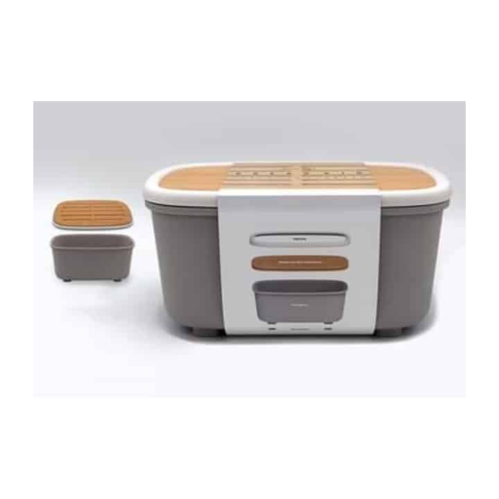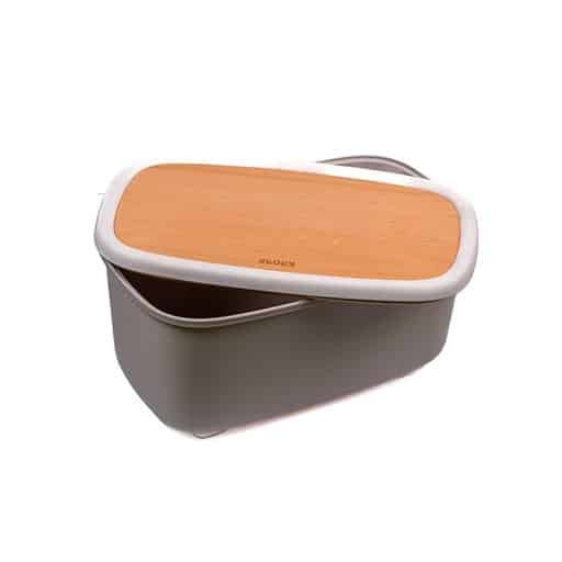 حافظة خبز من ماركة Kroff، تصميم مميز مصنوع من البلاستك بغطاء من الخشب يمكن استعماله لوح لتقطيع الخبز بابعاد 33.6×20.4×17.1سم